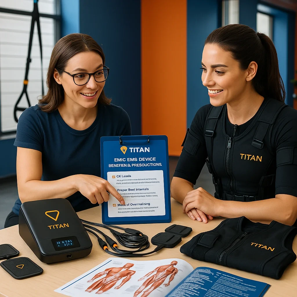 در این تصویر، مشاوره تخصصی مضرات ورزش ای ام اس را بین یک مربی برجسته و متقاضی باشگاهی می‌بینید؛ دستگاه EMS مدل تایتان، لوازم جانبی و نمودار علمی ایمنی و فواید ورزش ای ام اس کاملا نمایش داده شده‌اند تا انتخاب هوشمندانه را در باشگاه و خانه ممکن کنند.